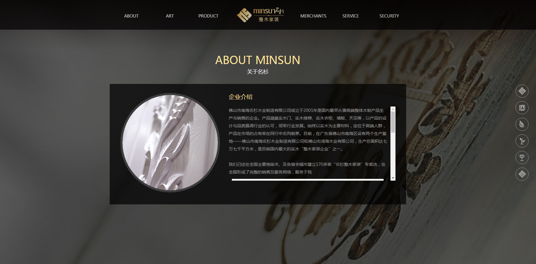佛山市南海名杉木業制造有限公司成立于2001年是國內最早從事高端整體木制產品生產與銷售的企業。產品涵蓋實木門、實木樓梯、實木衣柜、墻板、天花等,以產品的設計與品質贏得行業的認可,領軍行業發展。始終以實木為主要材料,定位于高端人群,產品在市場的占有率在同行中名列前茅。目前,在廣東省佛山市南海區設有兩個生產基地——佛山市南海名杉木業制造有限公司和佛山市鴻海木業有限公司,生產總面積達七萬七千平方米,是目前國內最大的實木“整木家裝企業”之一。