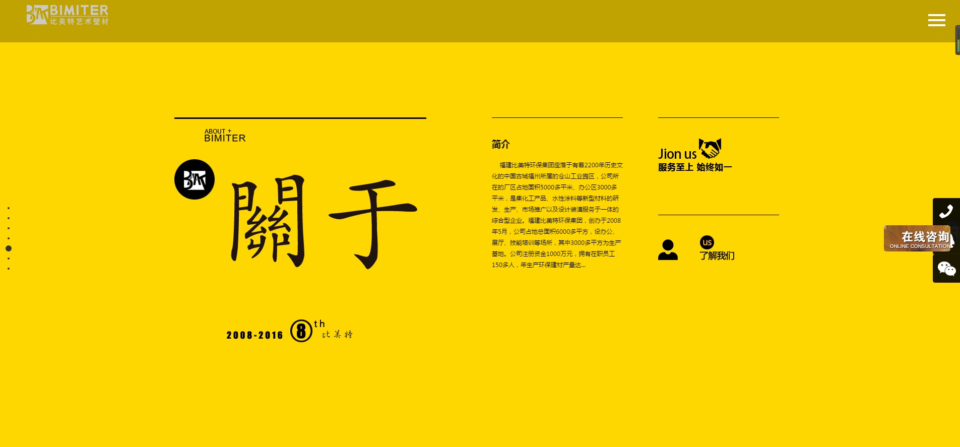 福建比美特環(huán)保集團(tuán)座落于有著2200年歷史文化的中國(guó)古城“福州”所屬的倉(cāng)山工業(yè)園區(qū),公司所在的廠區(qū)占地面積5000多平米、辦公區(qū)3000多平米,是集化工產(chǎn)品、水性涂料等新型材料的研發(fā)、生產(chǎn)、市場(chǎng)推廣以及設(shè)計(jì)裝潢服務(wù)于一體的綜合型企業(yè)。福建比美特環(huán)保集團(tuán),創(chuàng)辦于2008年5月,公司占地總面積6000多平方,設(shè)辦公、展廳、技能培訓(xùn)等場(chǎng)所,其中3000多平方為生產(chǎn)基地。