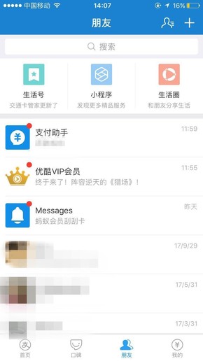 將支付寶更新到最新版本之后,“朋友”頁頂部增加了固定功能入口,“生活號”、“小程序”、“生活圈”被整齊的放在了頂部通欄上。不過,頂部區域下方消息列表保持不變,“我的客服”、“消息中心”、“支付助手”等模塊也都還在。微信小程序開發公司