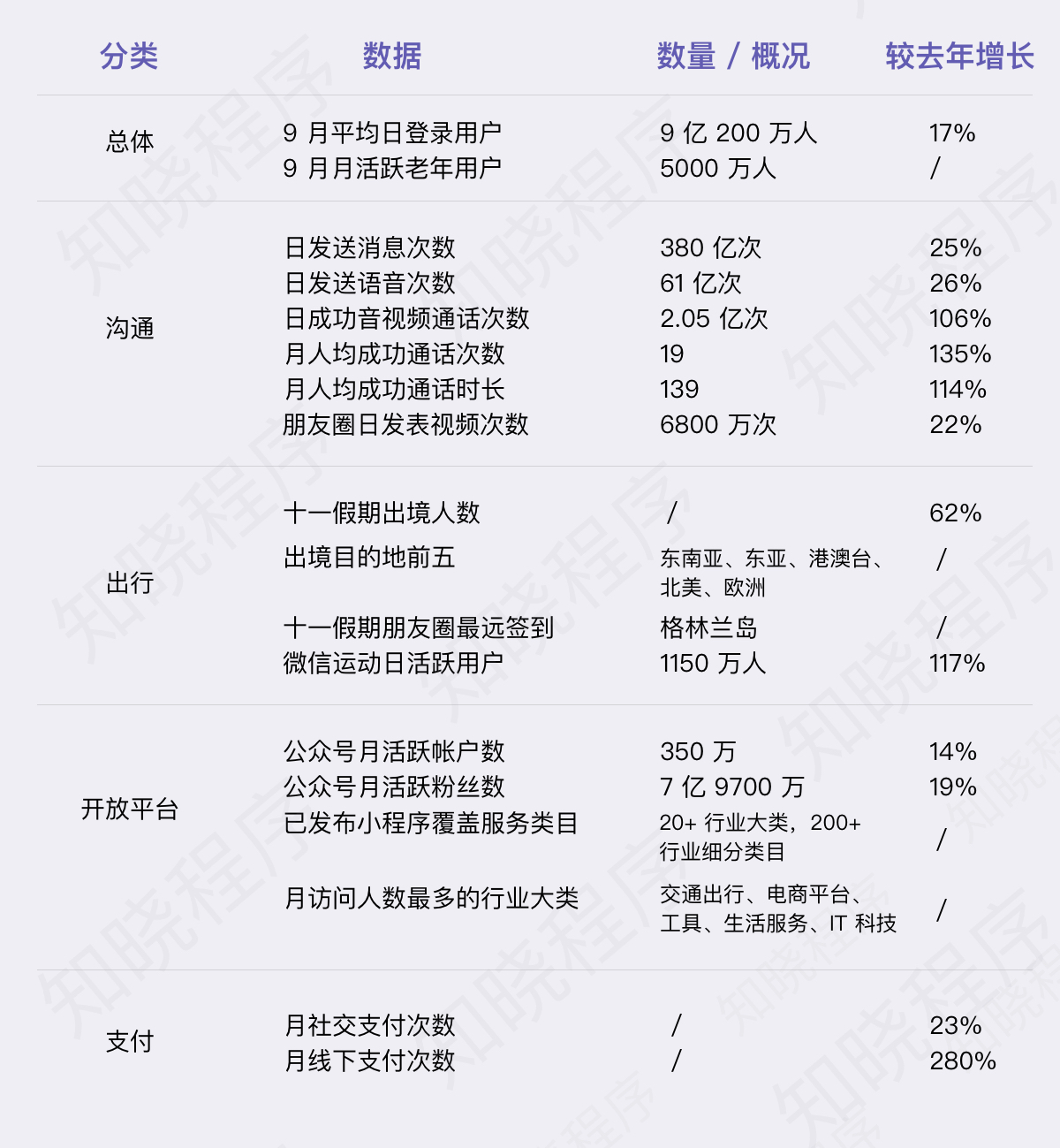 今年的報(bào)告,微信分別從總體(用戶)、溝通、出行、開放平臺(tái)、支付 5 個(gè)大類進(jìn)行了公布。其中,總體方面,微信日登陸用戶達(dá)到了 9 億 200 萬,數(shù)據(jù)較去年仍然實(shí)現(xiàn)了恐怖的 17% 的增長。在用戶體量已經(jīng)接近國內(nèi)人口邊際的情況下,微信把尋求新增長尾用戶瞄向了老年人。