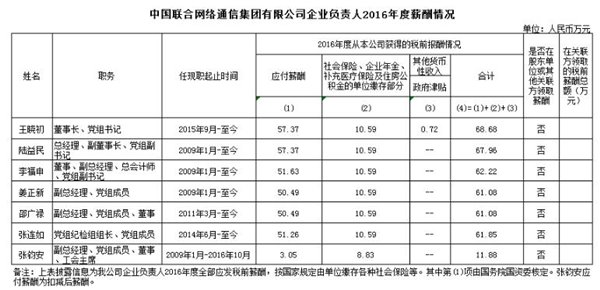 中國聯(lián)通公布2016年高管薪酬:董事長月收入不足6萬元