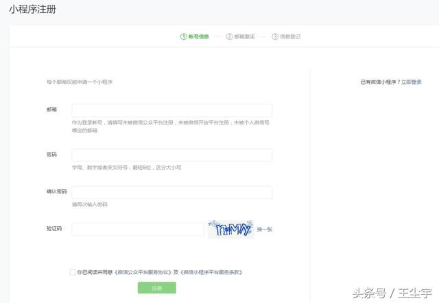 3.填寫注冊信息,郵箱不能和已經(jīng)注冊過公眾號和微信號的重復(fù),提交后郵箱會收到驗(yàn)證郵件。