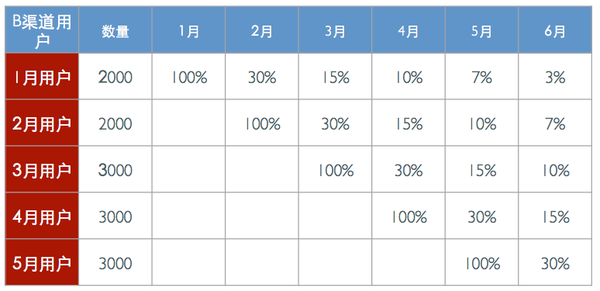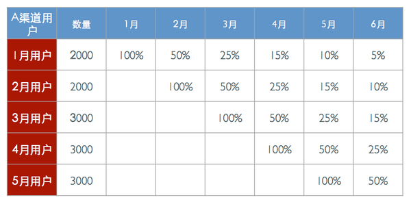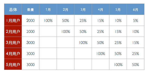這樣我們就知道某個月新注冊的用戶在接下來的第一個月的留存情況怎么樣,在第二個月里的活躍和留存情況如何。