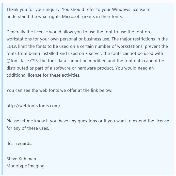 總結(jié)一下:由于用微軟雅黑顯示CSS中規(guī)定的字體,是客戶端顯示的事情,是微軟授權(quán)過的,所以就不需要再次授權(quán)了!!