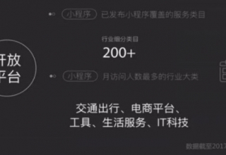 2017微信數(shù)據(jù)顯示,微信月平均日登陸用戶為902,000,000(日活9.02億),日發(fā)送次數(shù)達380億次;小程序目前已經(jīng)覆蓋交通出行、工具、電商平臺、IT科技與生活服務(wù)等200多個細分行業(yè)。